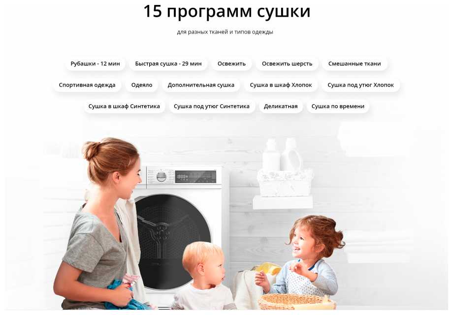 - Программы для хлопка, синтетики, шерсти, детских вещей и «Сушка в шкаф».