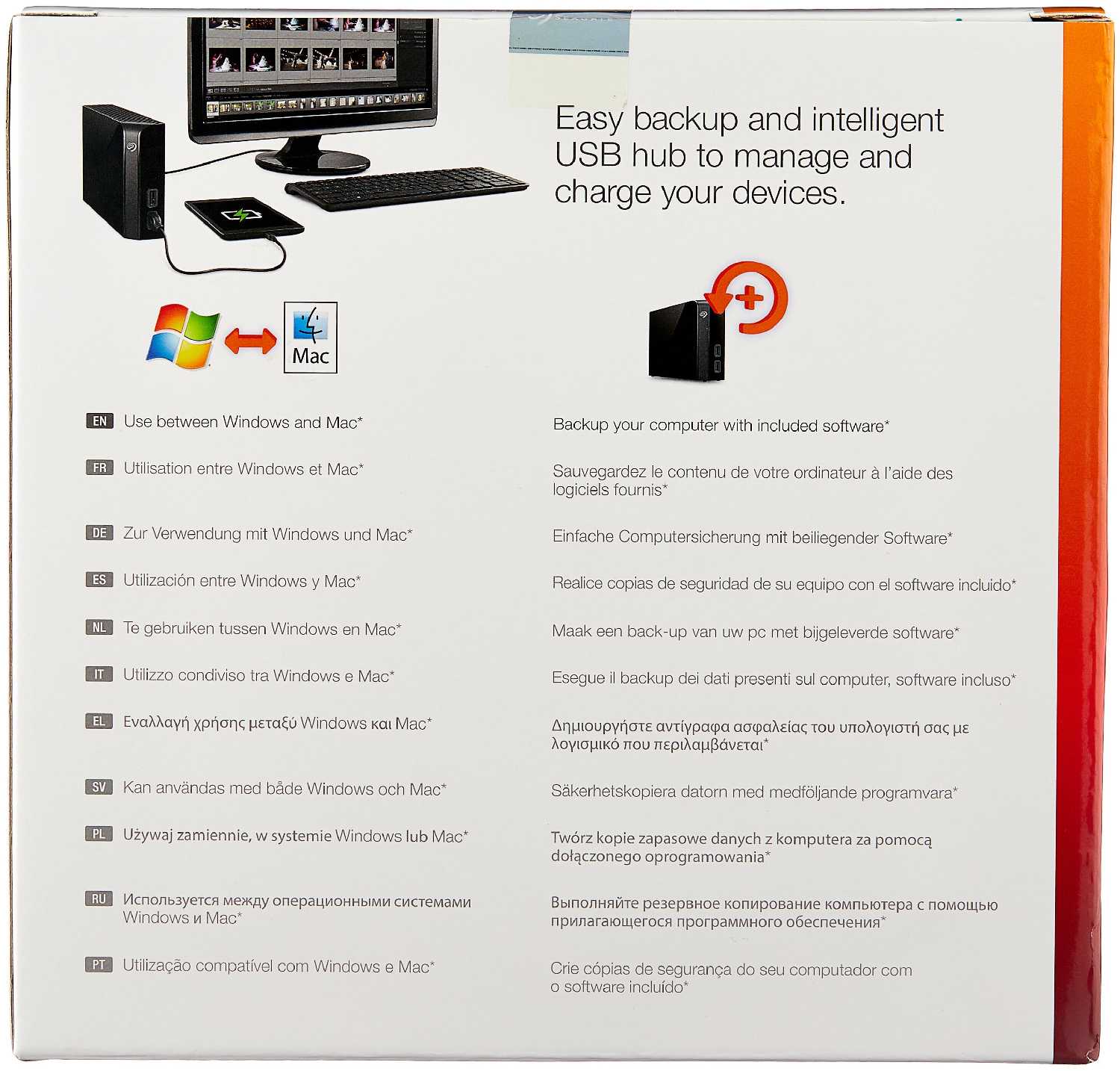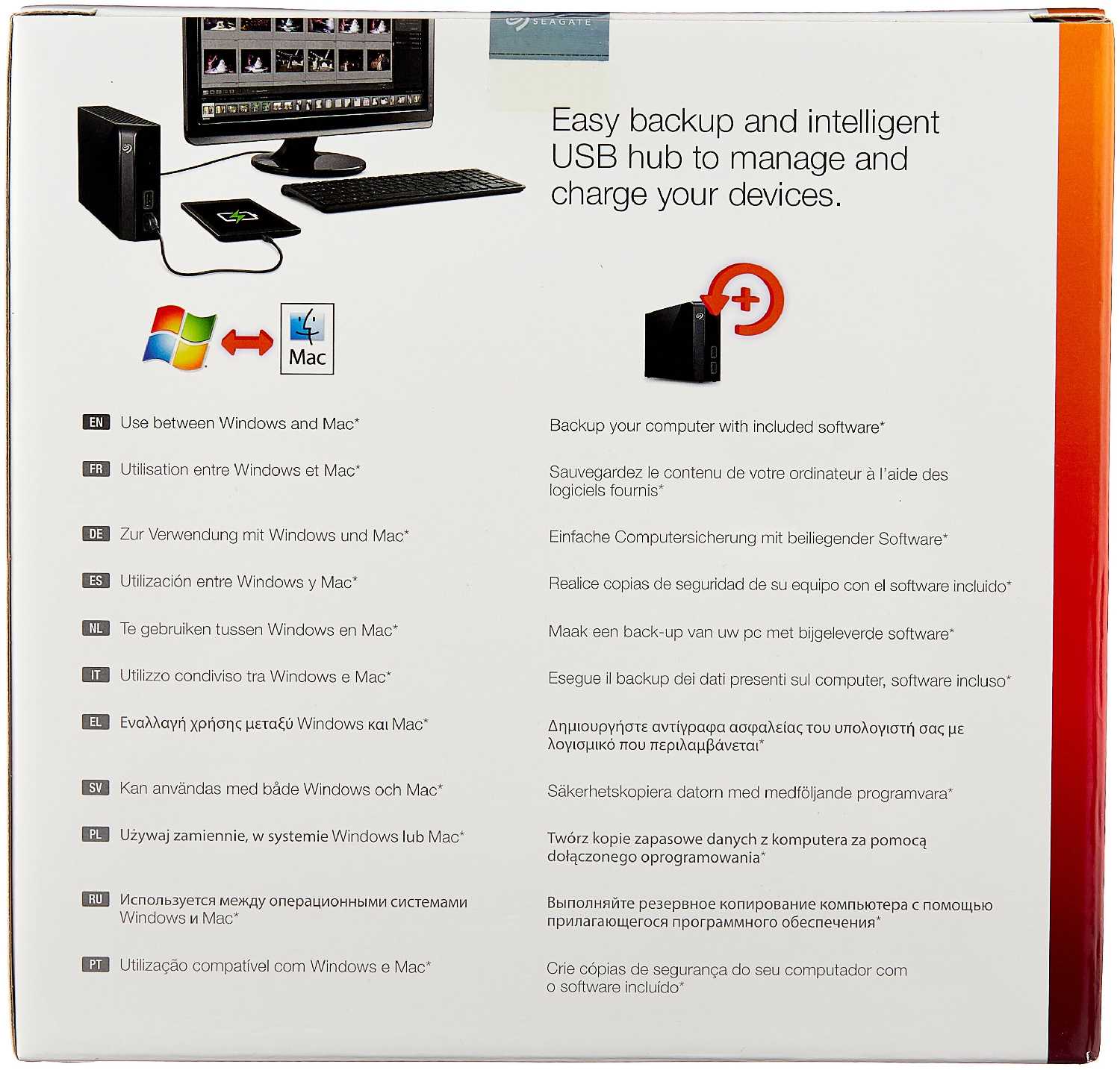 Комплектация : | диск Seagate Backup Plus Hub, кабель USB 3.0 длиной 1, 2 м, ПО для резервного копирования данных Seagate Dashboard, блок питания, руководство по быстрой установке, драйвер NTFS для Mac |