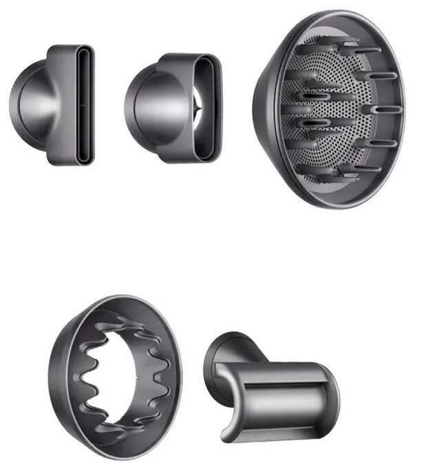 В набор входит 5 аксессуаров (концентратор, диффузор, широкая круглая насадка, выпрямляющая насадка необычной формы). Качество литья неидеально: встречаются заусенцы и цветовые неоднородности пластика. Диффузор критикуют за короткие "лапки" и мелкие прорези, затрудняющие создание объёма у корней.