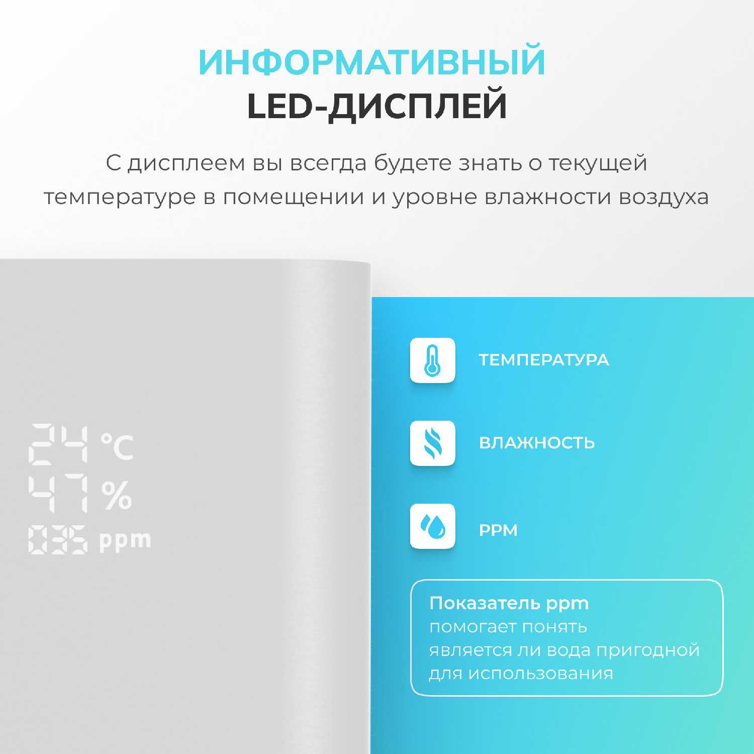 - Дисплей отображает реальную температуру, влажность и жесткость воды (ppm), что позволяет контролировать пригодность воды для испарения.