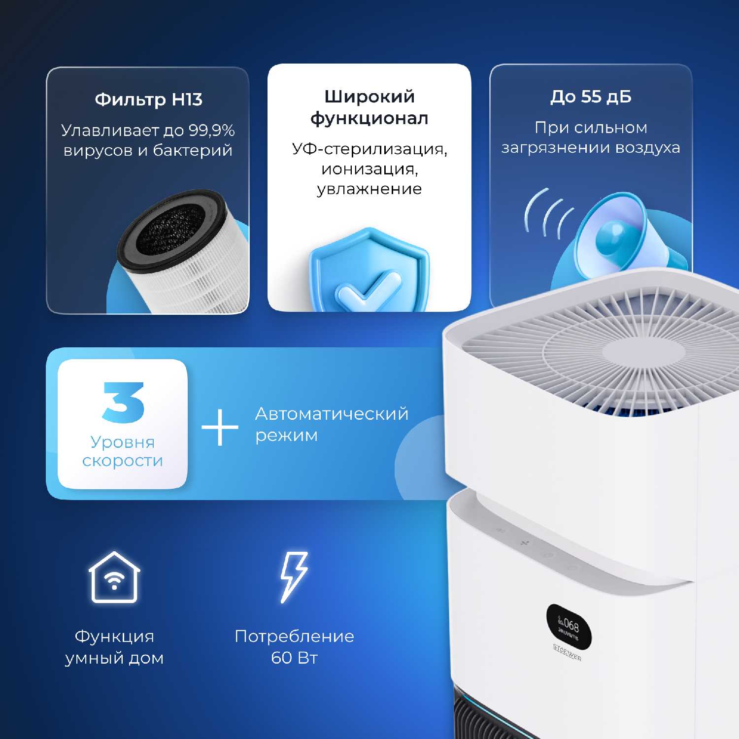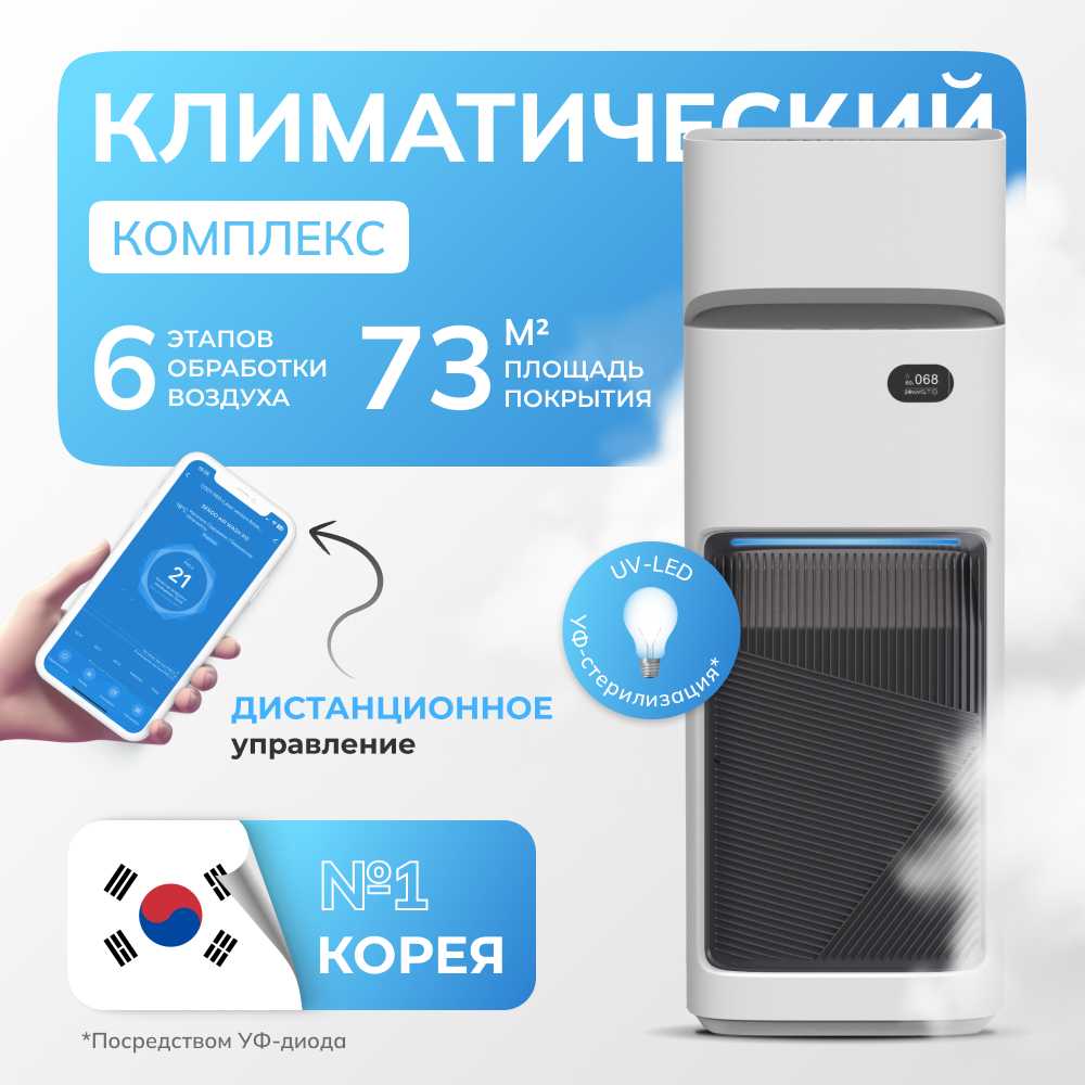 - Управление через мобильное приложение: удаленный запуск, выбор режимов, мониторинг параметров воздуха.