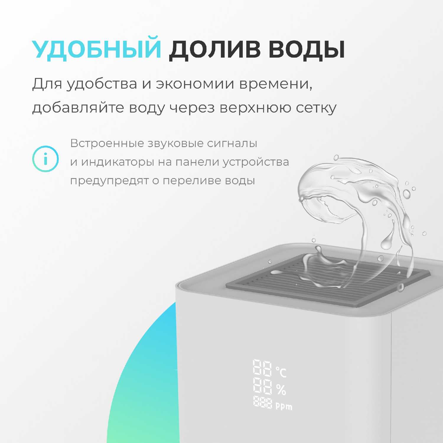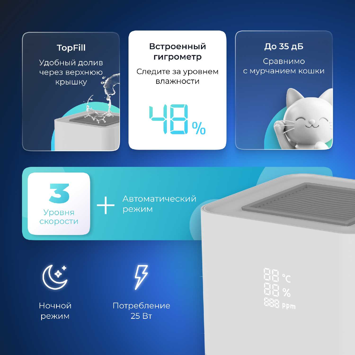 Конструкция устройства продумана для ежедневного использования: верхний долив воды без необходимости снимать бак, съёмные элементы для лёгкой очистки, регулируемая подсветка экрана. Однако ёмкости хватает всего на сутки, а при работе на максимальной скорости вода расходуется быстрее (до 2 литров за 12 часов). Пользователи ценят ночной режим с пониженным шумом, хотя некоторые отмечают, что даже в этом случае гул вентилятора может мешать чувствительным людям. Серьёзный минус — отсутствие функции задания целевой влажности: прибор не адаптирует работу под желаемые показатели, что ограничивает автоматизацию.