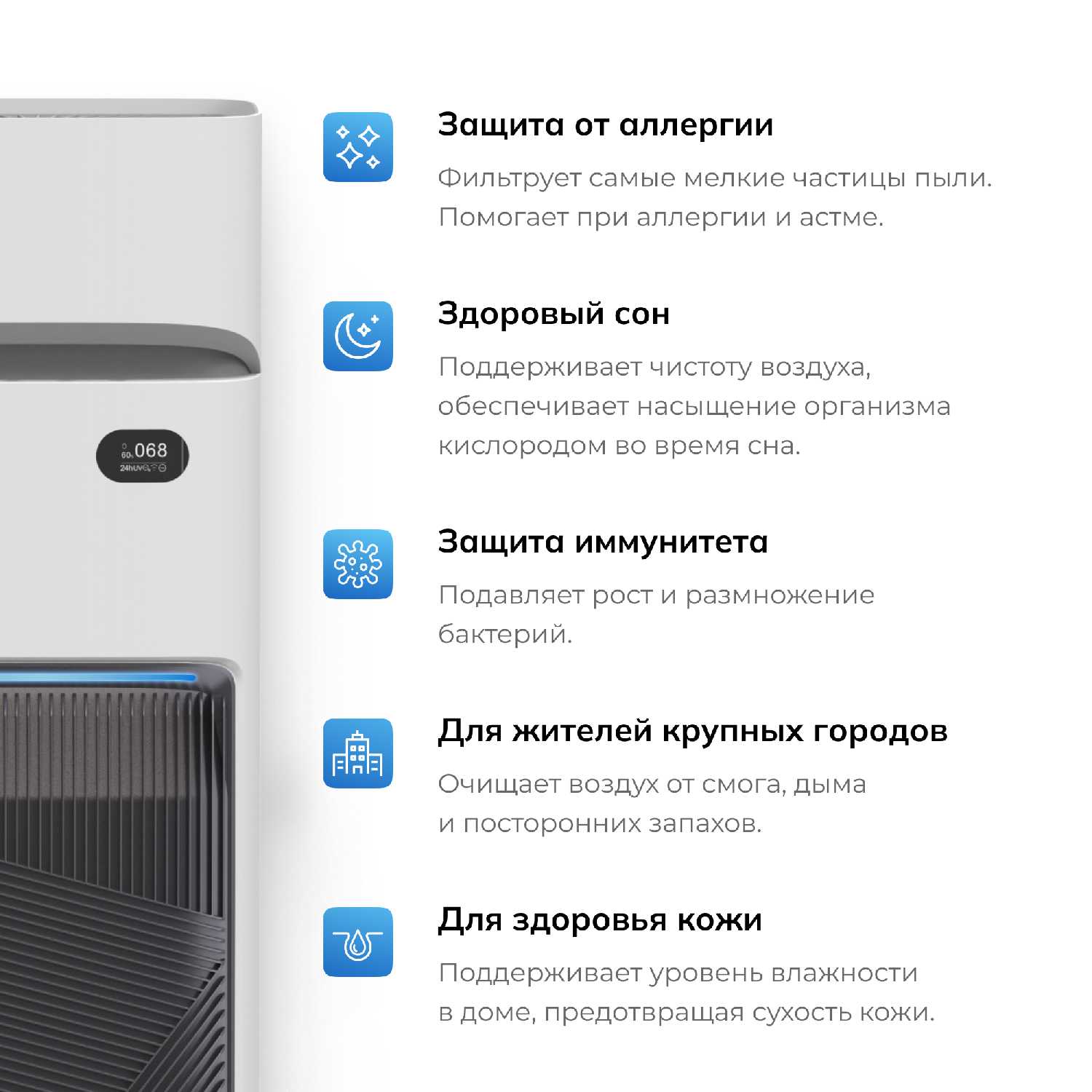 Устройство оптимально для аллергиков, астматиков и владельцев животных: оно эффективно улавливает шерсть, пыльцу и частицы пыли. Также его оценят жители регионов с сухим климатом или квартир с низкой влажностью. Однако людям с чувствительными лёгкими стоит соблюдать дистанцию: нахождение ближе 2 метров может провоцировать кашель из-за интенсивного потока воздуха. Прибор не подходит для быстрого увлажнения больших площадей — здесь лучше выбрать специализированные модели. Ограниченная интеграция с «Умным домом» (только базовое управление через приложение) разочарует любителей автоматизации.