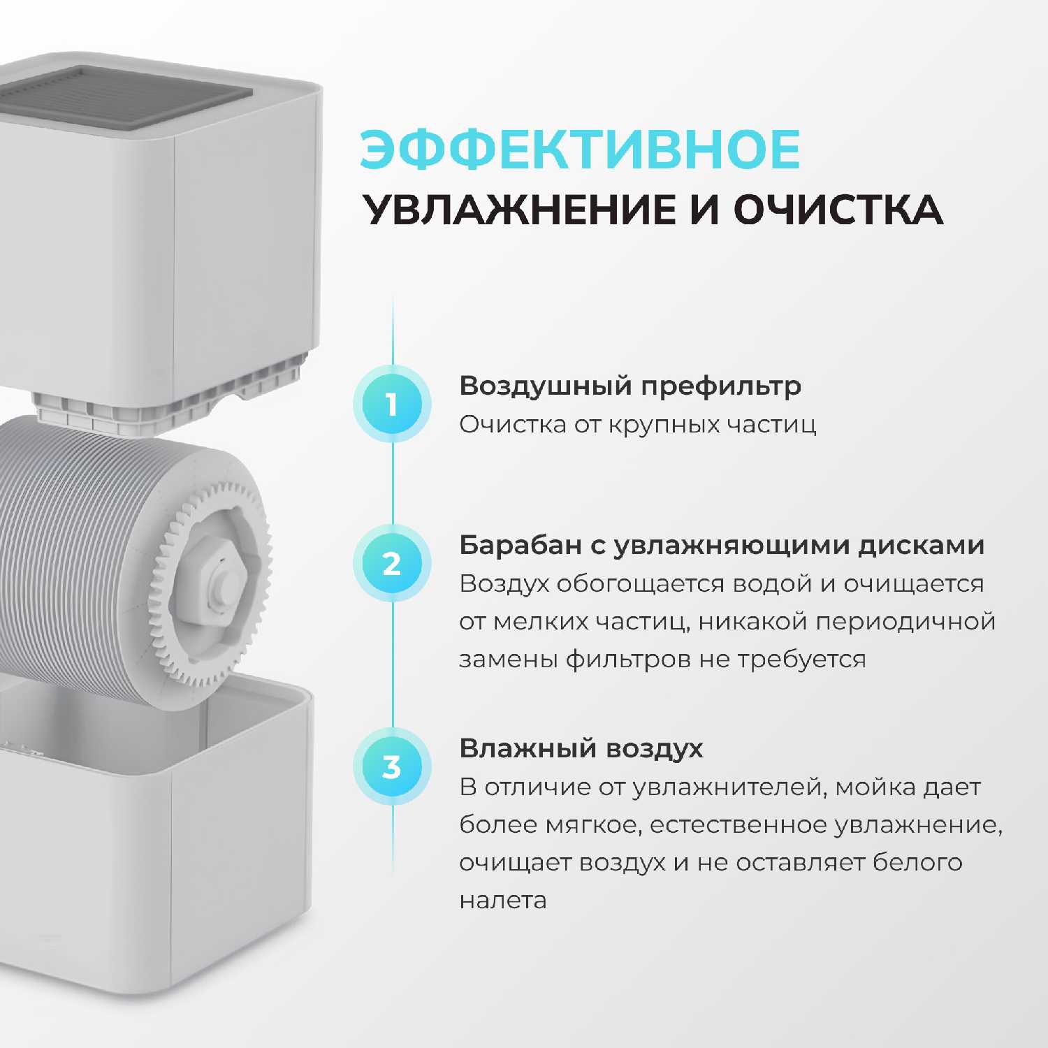 - Конструкция с естественным испарением позволяет воде равномерно насыщать воздух, создавая устойчивый микроклимат даже после отключения прибора.