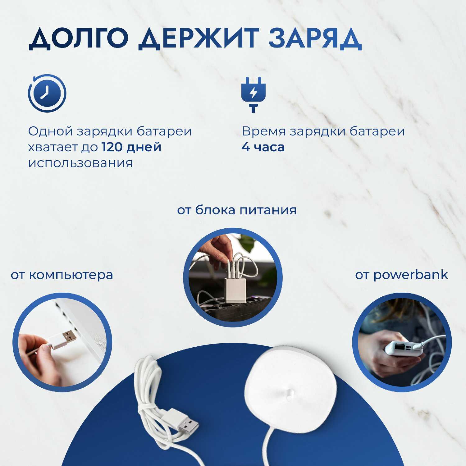 - Зарядка через USB без адаптера, удобно для путешествий.