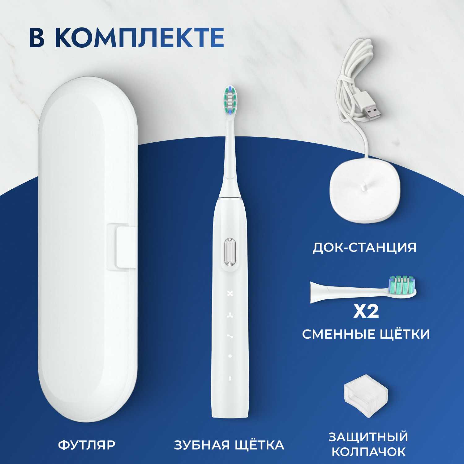 В комплекте 2 насадки с колпачками, зарядная станция, дорожный чехол и иногда USB-провод без адаптера. Чехол удобен для поездок. Пользователи докупают дополнительные насадки для семьи. -