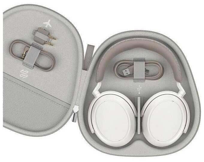 - В комплекте — жёсткий кейс с отделением для кабелей, кабель USB-C → 3.5 мм, адаптер для самолётов.