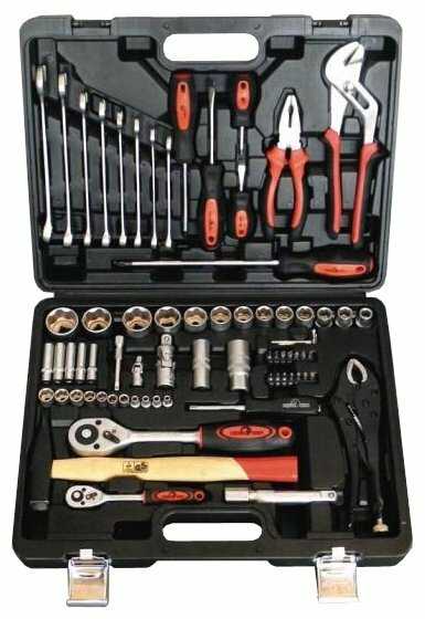 | Инструменты в комплекте : | клещи переставные, ключи гаечные, ключи имбусовые (шестигранные), молоток, отвёртки, пассатижи, струбцина, трещотка |
