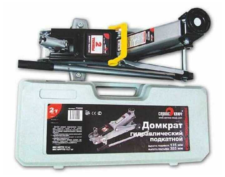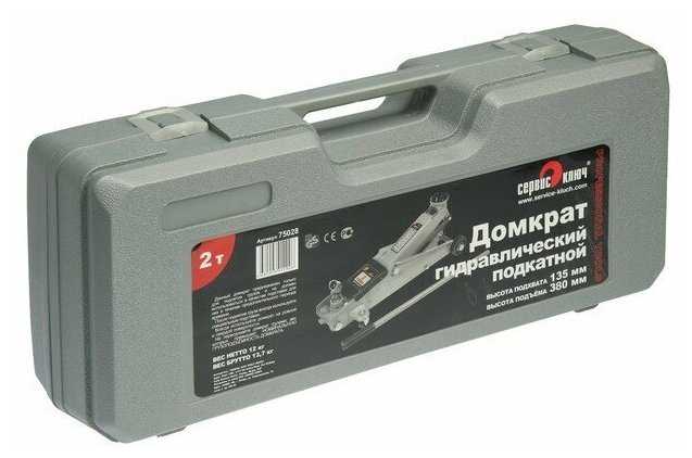 Подробная комплектация : | домкрат подкатной в кейсе 2т (высота 135-380мм) 75028 Сервис ключ - 1 шт. |