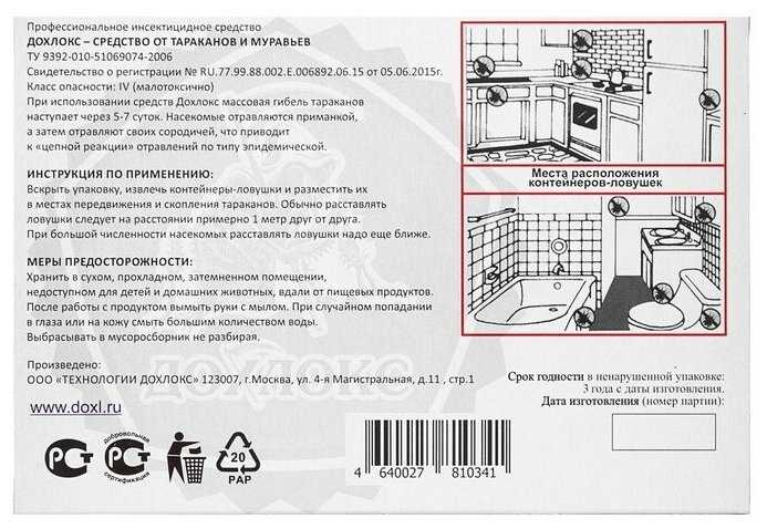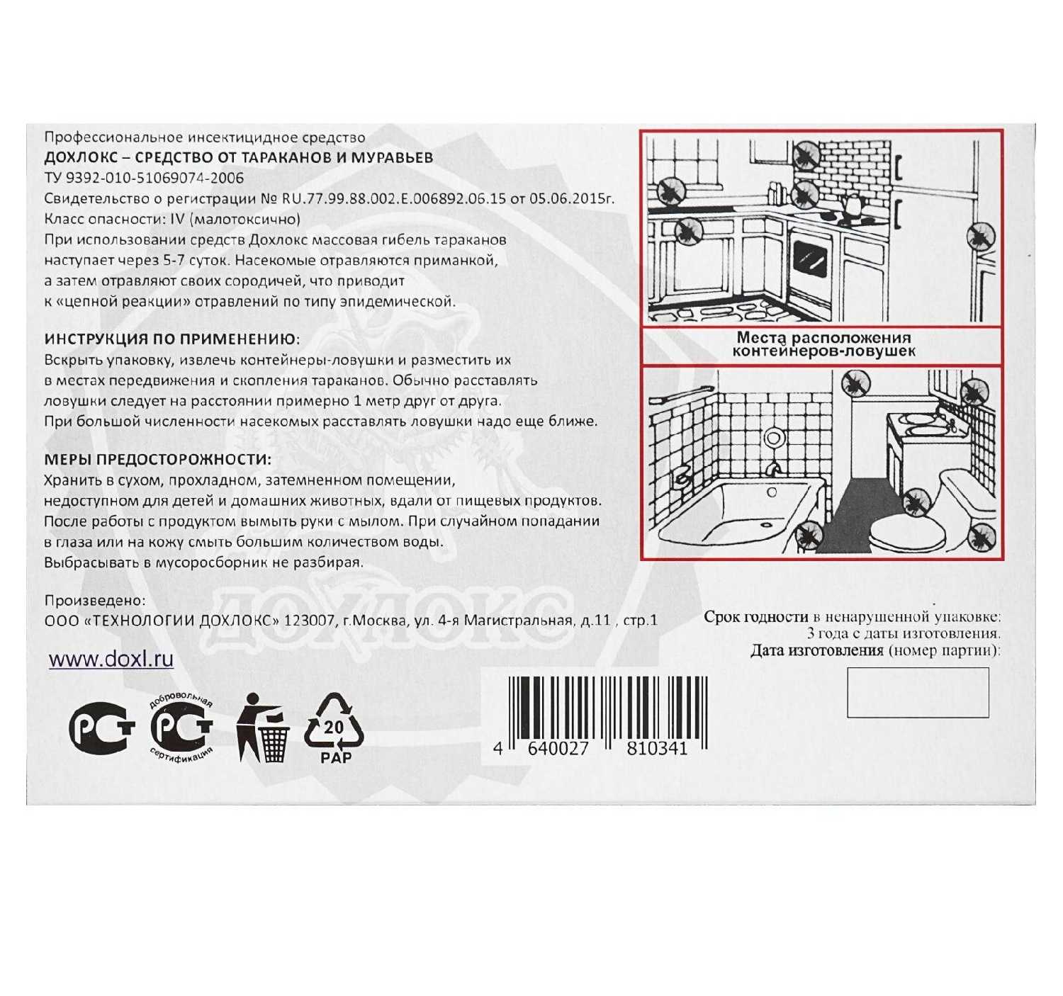 Способ применения : | ловушки вынуть из упаковки и разместить в местах появления и передвижения тараканов, не допускать контакта с маленькими детьми и домашними животными, после работы вымыть руки с мылом |