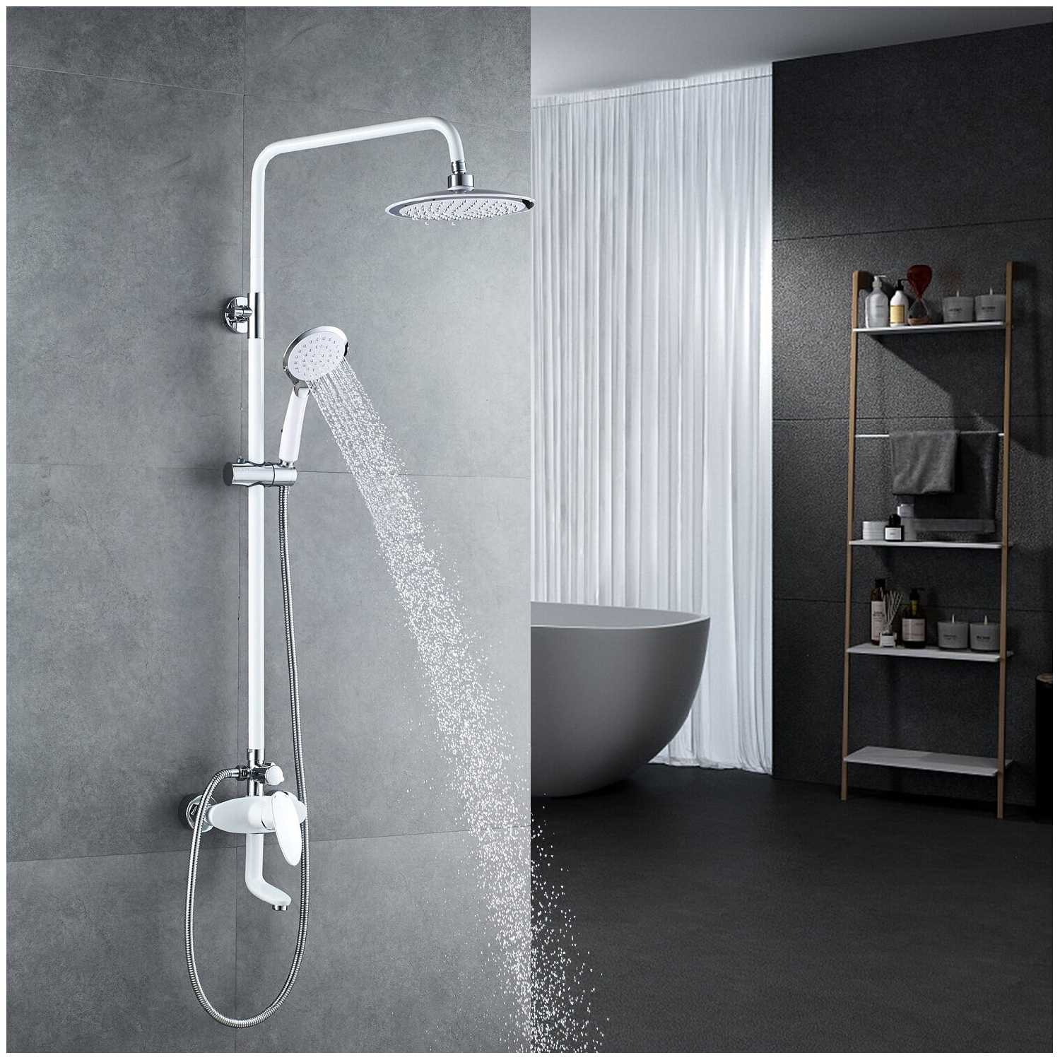 | Комплектация : | верхний душ, держатель лейки, душевая стойка, душевая штанга, излив для набора воды, кронштейн для верхнего душа, лейка, набор эксцентриков, ручной душ, смеситель, шланг, эксцентрик |