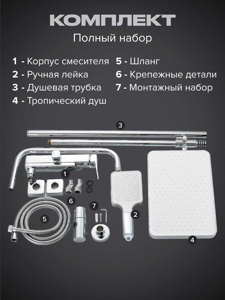 Комплектация : | верхний душ, гигиенический душ, держатель лейки, душевая стойка, душевая штанга, излив для набора воды, кронштейн, лейка, ручной душ, смеситель, шланг, эксцентрик |