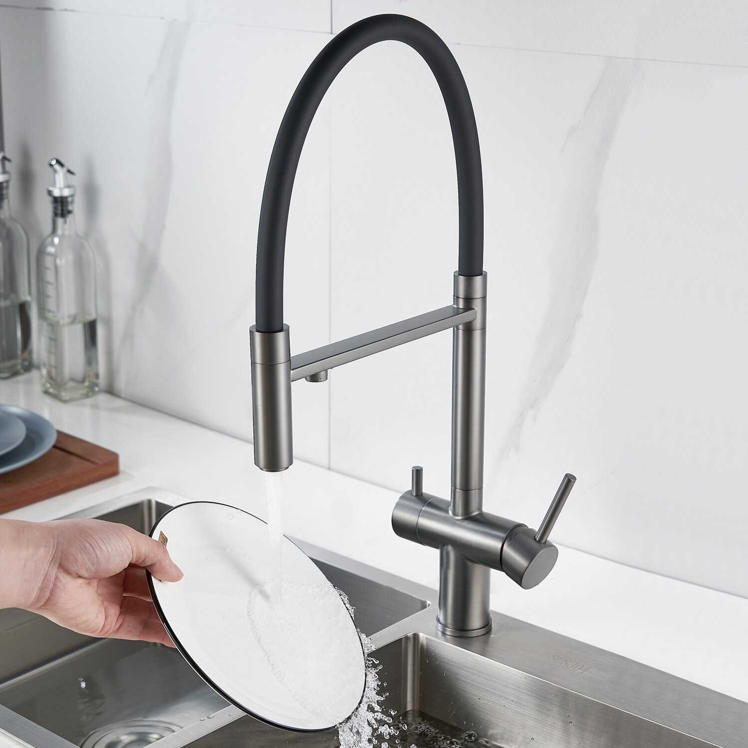 Кран в чёрном цвете с фильтром и гибкой лейкой оказался очень стильным — на кухне смотрится прям дорого. А гибкая лейка — просто спасение, когда мою большие кастрюли.