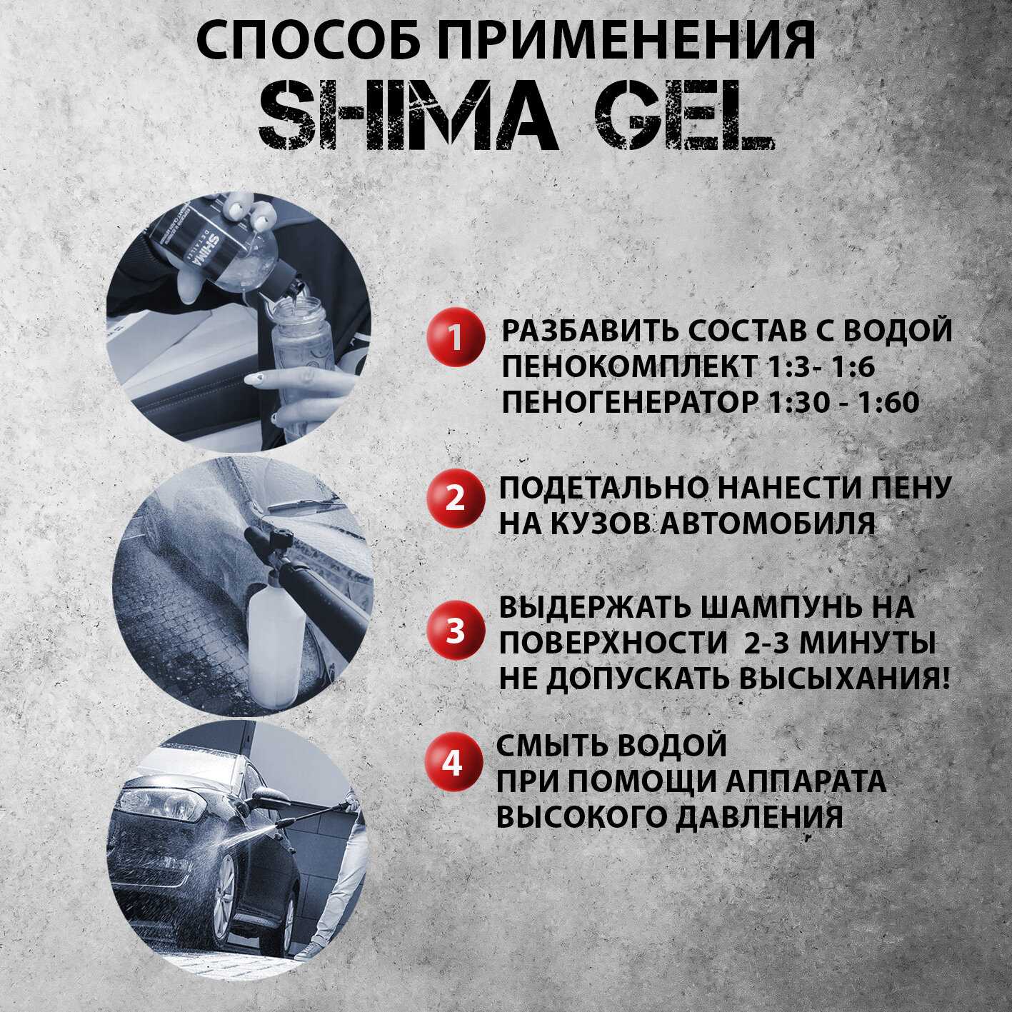 Способ применения : | 1. В зависимости от степени загрязнения разбавить шампунь с водой в пропорции 1:3-1:5 (из расчета 200-300 мл раствора на 1 л воды) при нанесении с помощью пенокомплекта, 1:50 при нанесении с помощью пеногенератора. 2. Смыть с поверхности общее загрязнение. 3. Равномерно нанести разбавленный шампунь на поверхность автомобиля, подождать 1-2 мин. Не допускать высыхания. 4. Смыть водой при помощи аппарата высокого давления, протереть. |