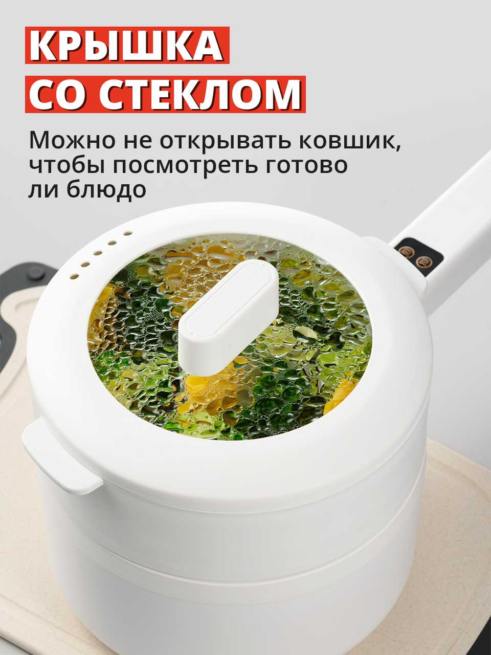 Удобство и эргономика: Прибор легкий (около 1 кг) и компактный, занимая мало места, что идеально для хранения в поездках или на маленькой кухне. Управление интуитивное после освоения: цифровая панель с программами для супа, каши и пара осваивается за 10-15 минут методом проб. Прозрачная крышка позволяет наблюдать за процессом без открытия, снижая риск ожогов. Мытье простое, чаша снимается и очищается легко, без остатков при варке. Однако длинная ручка делает хранение неудобным, как у обычной кастрюли. Отсутствие инструкции усложняет настройку таймера и отложенного старта, особенно для новичков. Насадка для пара удобна для двух блюд одновременно, заменяя отдельную пароварку. Электропитание через ручку оригинально, но делает конструкцию менее стабильной на столе. Пользователи хвалят малый размер для одного человека, где он помещается в рюкзак для путешествий. В 70% отзывов подчеркивают удобство для быстрой готовки лапши, яиц или овощей без лишних усилий. Шум минимальный, но без сигнала окончания приходится проверять вручную.