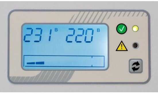 - Регулируемое выходное напряжение. Возможность задать напряжение от 220 до 230 В с шагом 1 В позволяет точно настроить питание под конкретные потребности.