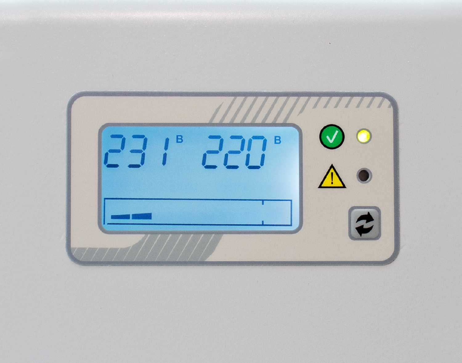 - Программная настройка выходного напряжения (220В или 230В) адаптирует устройство под требования чувствительной техники.