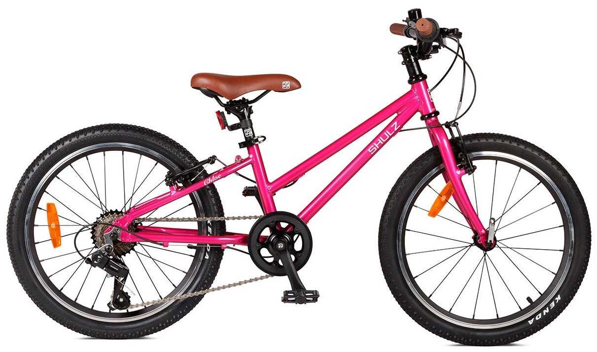 Shulz Chloe - легкий алюминиевый велосипед для девочек от 6 до 8 лет. Изогнутая геометрия вилки облегчает управление, а зубастые покрышки позволяют комфортно ездить по разным поверхностям. Этот велосипед идеально подходит для детей, которые только начинают осваивать езду на двух колесах, благодаря адаптированным тормозным ручкам, легкости и удобству посадки на него)