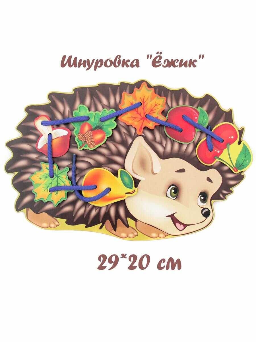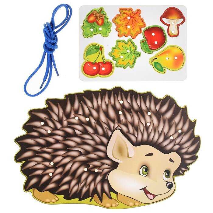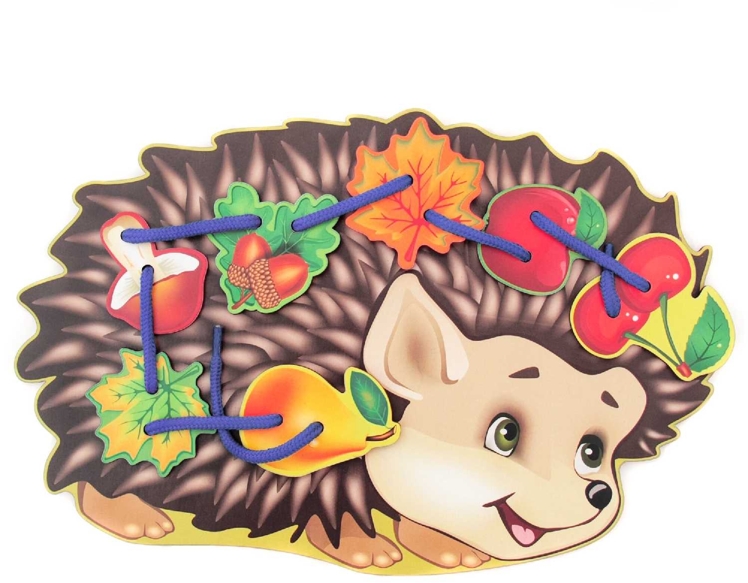 Дополнительная информация : | в комплект входит: деревянная панель в виде Ёжика с отверстиями для продевания шнурка – 1 шт., фигурки фруктов ягод грибов и листиков с отверстиями для продевания шнурка, шнурок – 1 шт |
