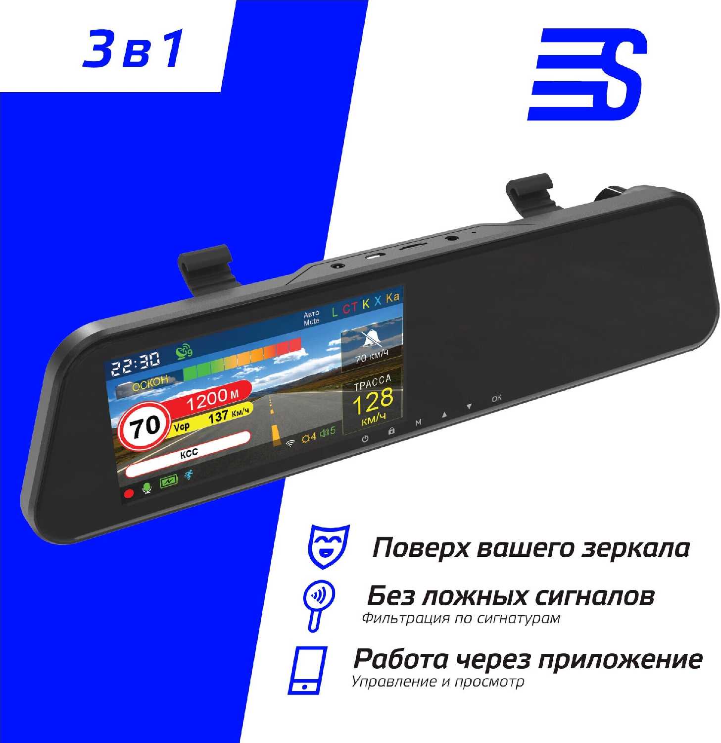 - Совмещает видеорегистратор, радар-детектор и GPS-информатор в корпусе зеркала.