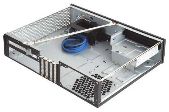 6) Сделан качественно, крепко. Есть съёмное ребро (хотя конструктивно оно никакое не ребро) жёсткости, что позволяет устанавливать на корпус какие-либо не очень тяжёлые предметы, типа небольшого телевизора. В слотах для устройств расширения (PCI, PCI-E) по умолчанию установлены не глухие заглушки, а перфорированные, с отверстиями. Кроме того само крепление устройств расширения заслуживает отдельной похвалы - сначала оно (устройство) вставляется в ответную часть (внизу в корпусе есть специальные пазы для этих целей), а потом сверху крепится болтом. Получается нереально прочно и надёжно. - - 1) Нужно тщательно выбирать кулер для процессора. Поддерживаются только низкопрофильные кулеры (что неудивительно при размерах корпуса);