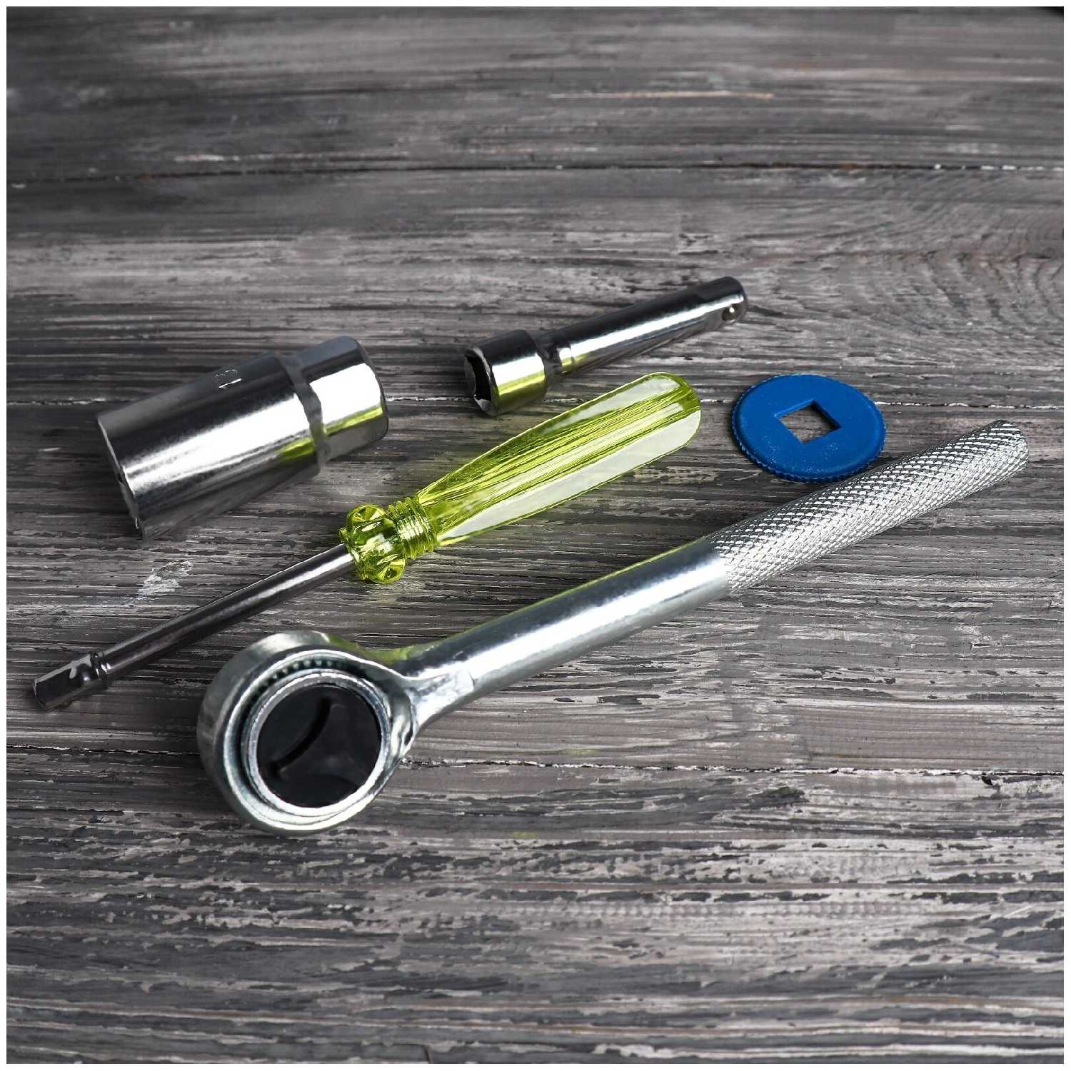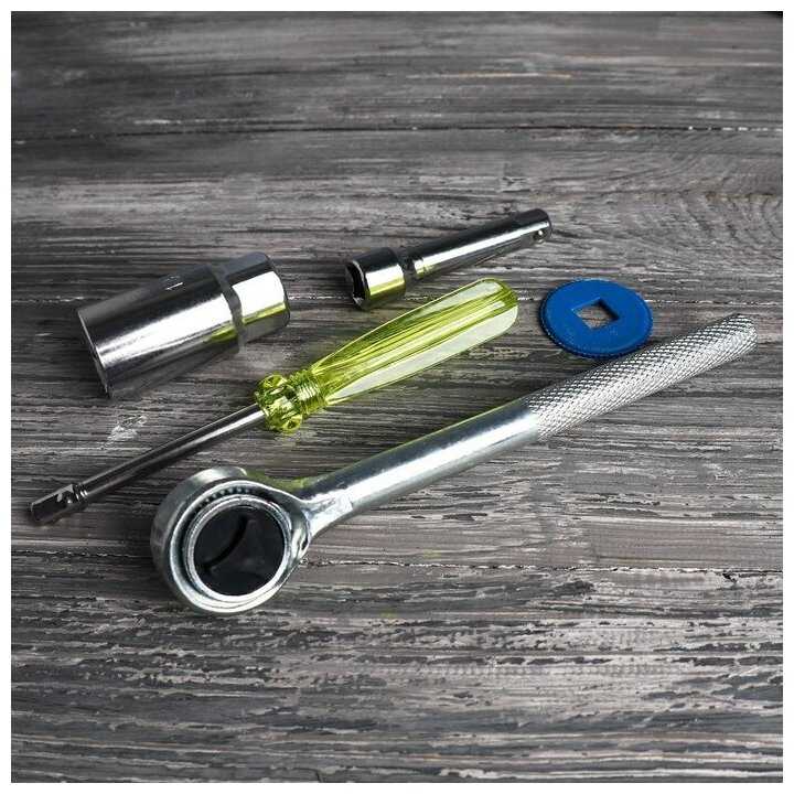 Инструменты в комплекте : | вороток для головок, отвёртки, трещотка |