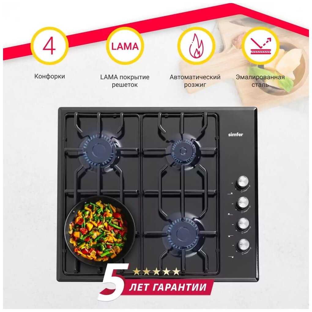 - Эргономичная варочная панель с электроподжигом и конфорками разного диаметра: