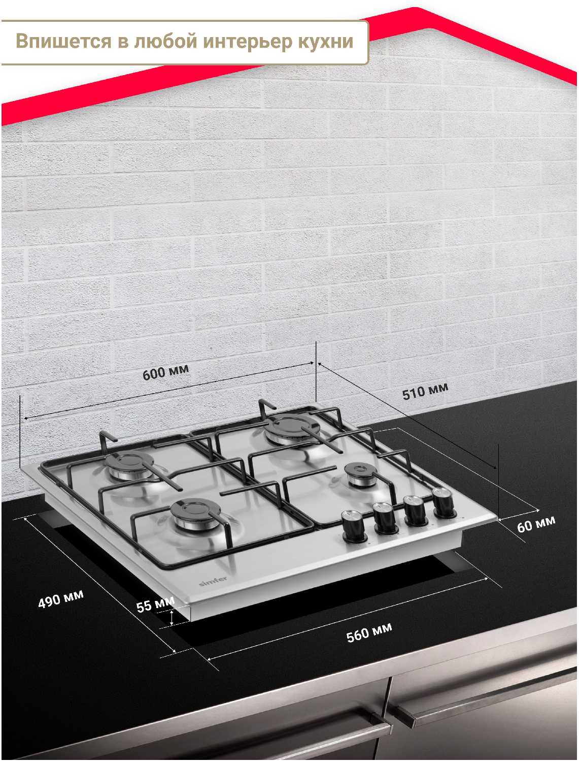 Размеры варочной панели (ШхГхВ) : | 60х52х5.50 см |