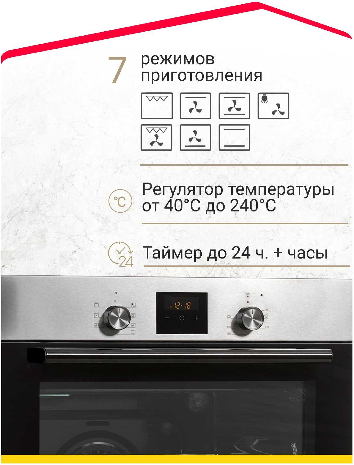 Режимы нагрева духового шкафа : | верхний + нижний нагрев, нижний нагрев + конвекция, нижний нагрев, гриль + конвекция, верхний нагрев + конвекция, малый гриль, верхний нагрев |