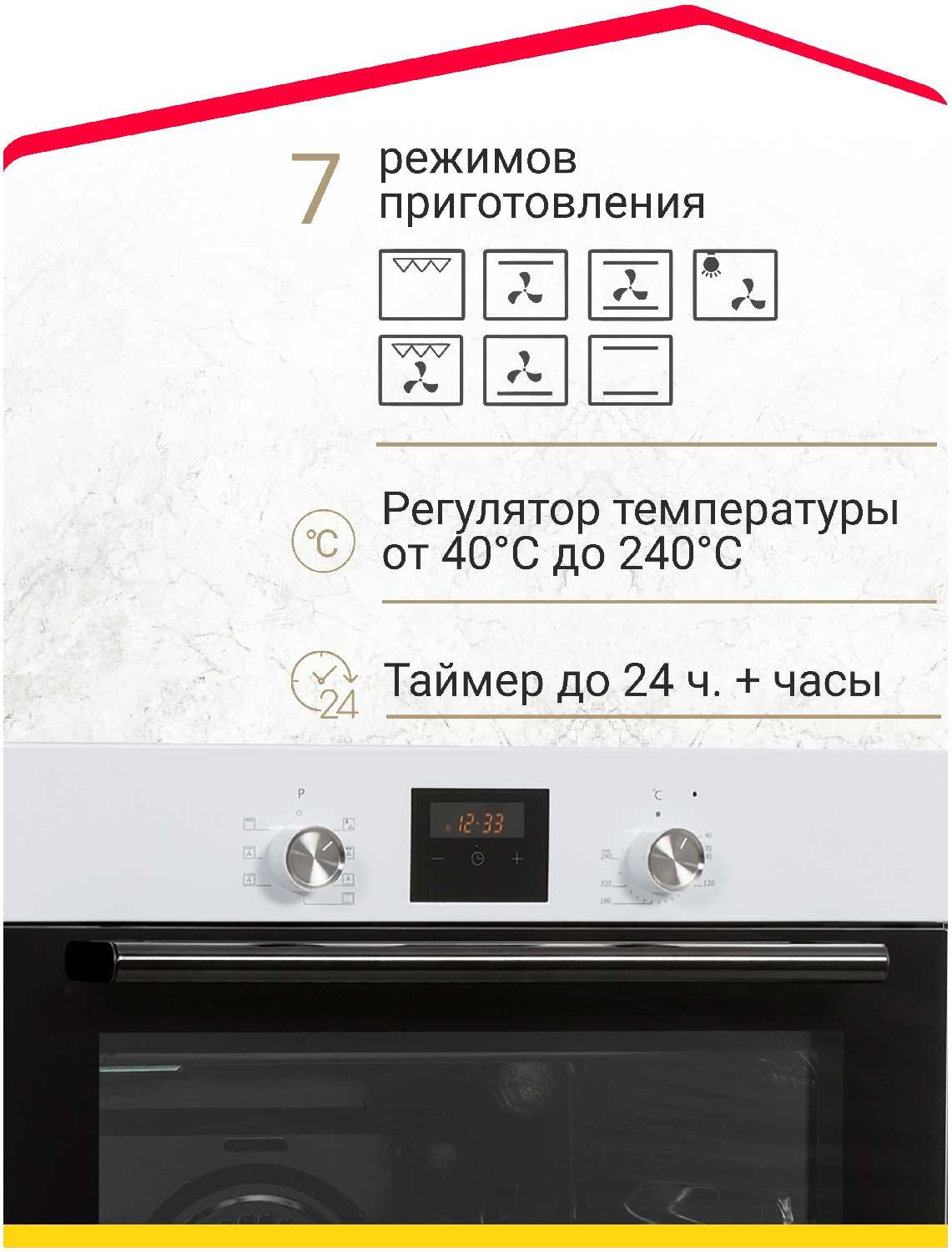 Режимы нагрева духового шкафа : | верхний + нижний нагрев, нижний нагрев + конвекция, нижний нагрев, гриль + конвекция, верхний нагрев + конвекция, малый гриль, верхний нагрев |