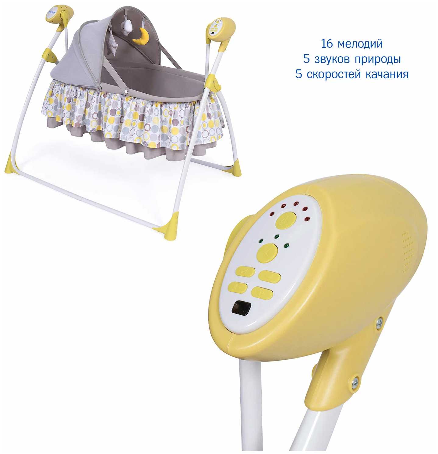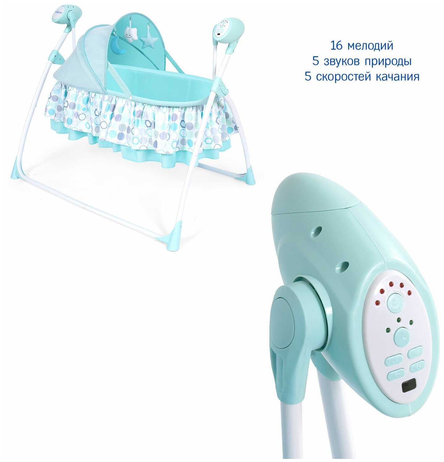 Одна из самых бюджетных колыбелей с авто-укачиванием, 5 режимов работы, за это ее и выбрала. Управление расположено так что малыш при весм желании к нему не дотянется, да и мне подходить не мешает. Игрушек правда не так много, но мы свои погемушки докладываем.