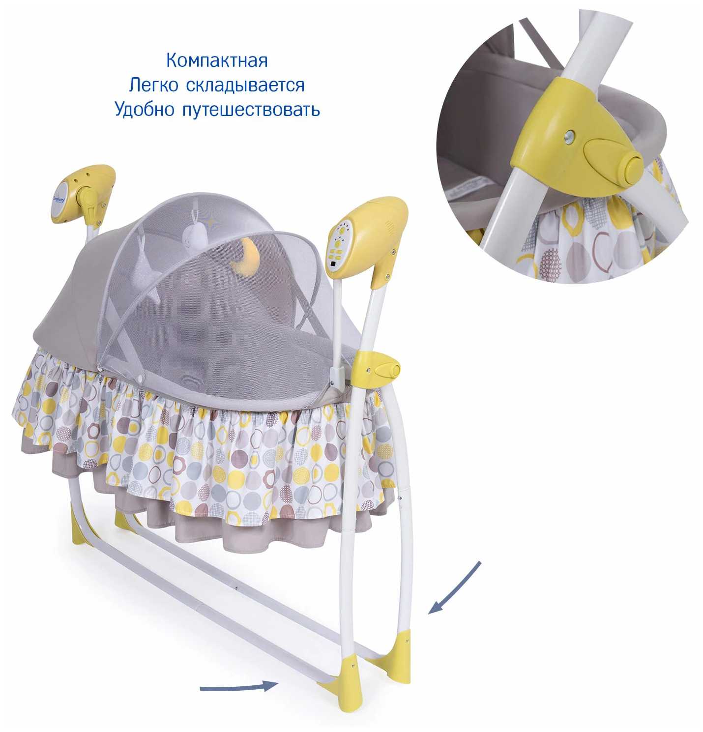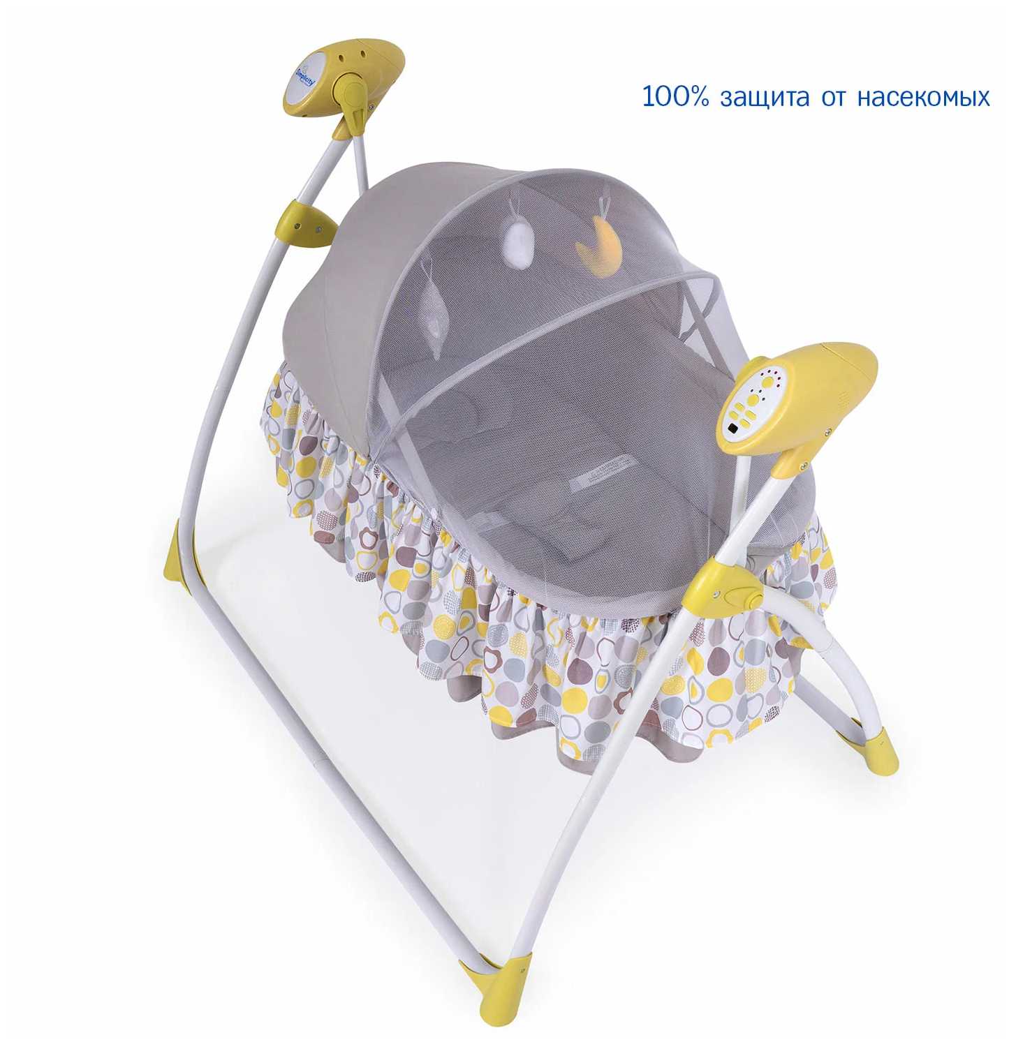 Колыбель с надежной конструкцией, которая легко складывается и её можно быстро убрать, если надо. Под легкое укачивание и спокойные мелодии малыш легко засыпает.
