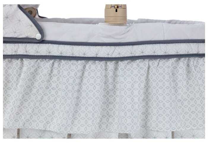 Выбрала в расцветке crystal, очень симпатичные тона, внутри белая отделка из стеганой ткани, а сверху серо-бежевый рисунок. В глаза не бросается. Корзина оформлена в цвет основной отделки. Я довольна, матрасик средней жесткости в комплекте, докупила лишь наматрасник. чтобы исключить протечки.