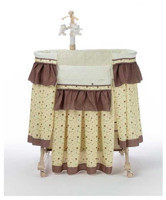 Отделка порадовала, в постельных тонах, мы и постельное взяли примерно в таком же цвете, собрали минут за 30, прикрутили ножки и ложе поставили на место. Мобиль не только мелодии проигрывает, но и запускает игрушек, я заметила что дочка постоянно на них засматривается перед сном)