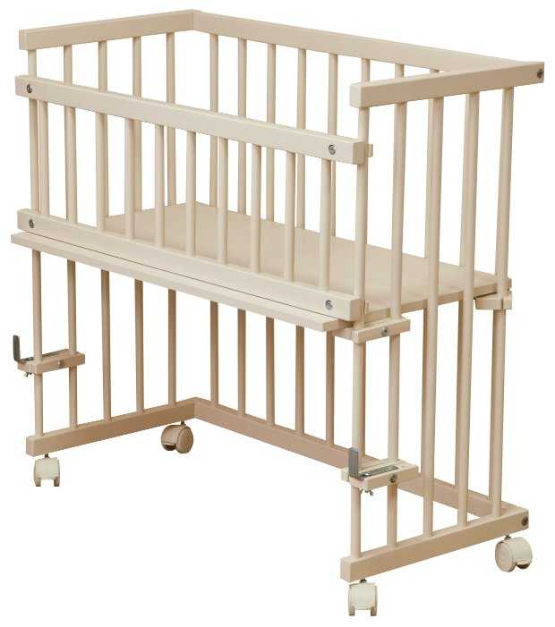 - Боковая стенка опускается, позволяя плотно пристегнуть колыбель к родительской кровати.
