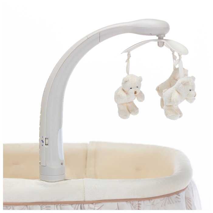 Взяли для нашей Машеньки, колыбель в приятных персиковых тонах, игрушки без постороннего запаха, так еще и кружатся, запускаем вместе с мелодиями.