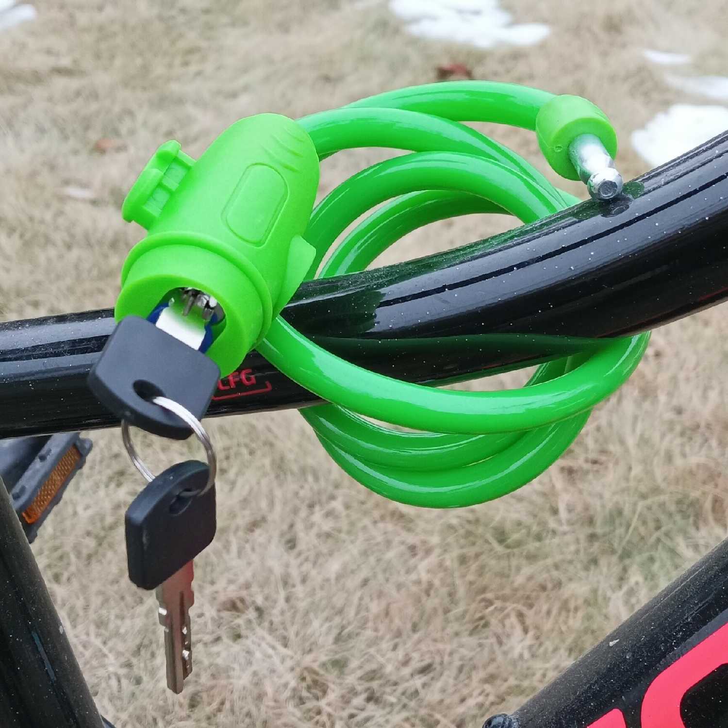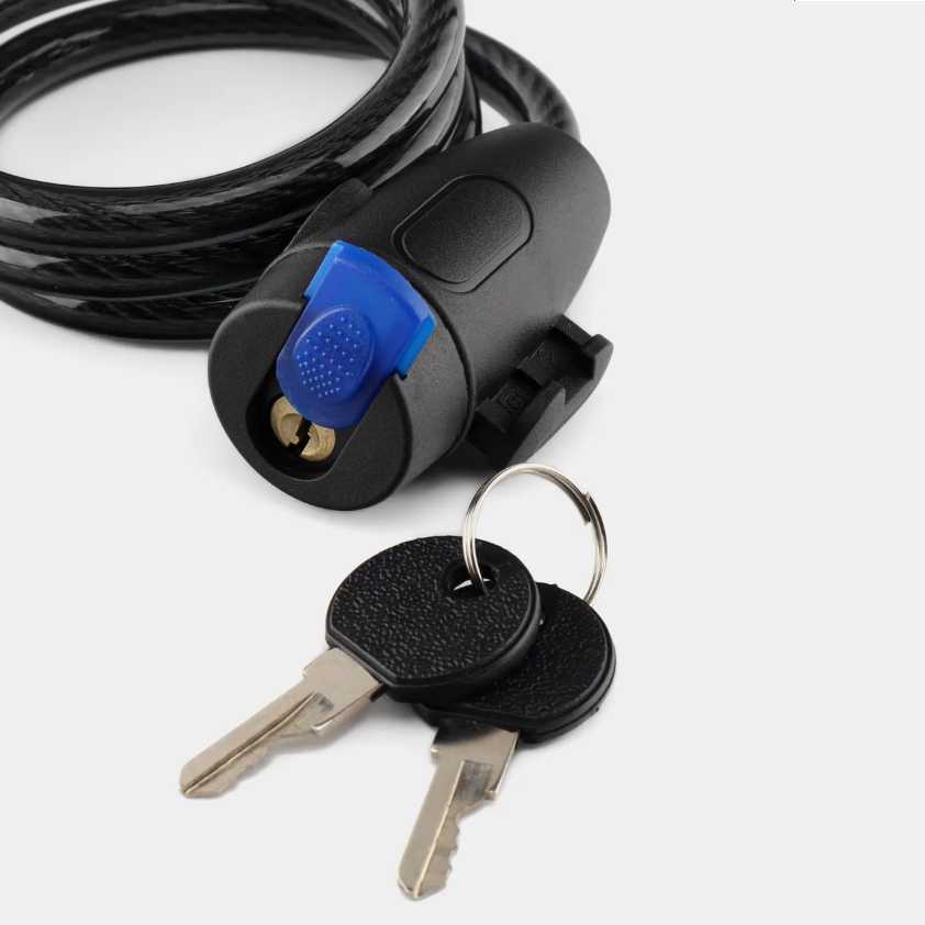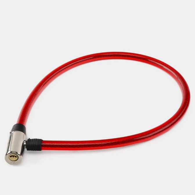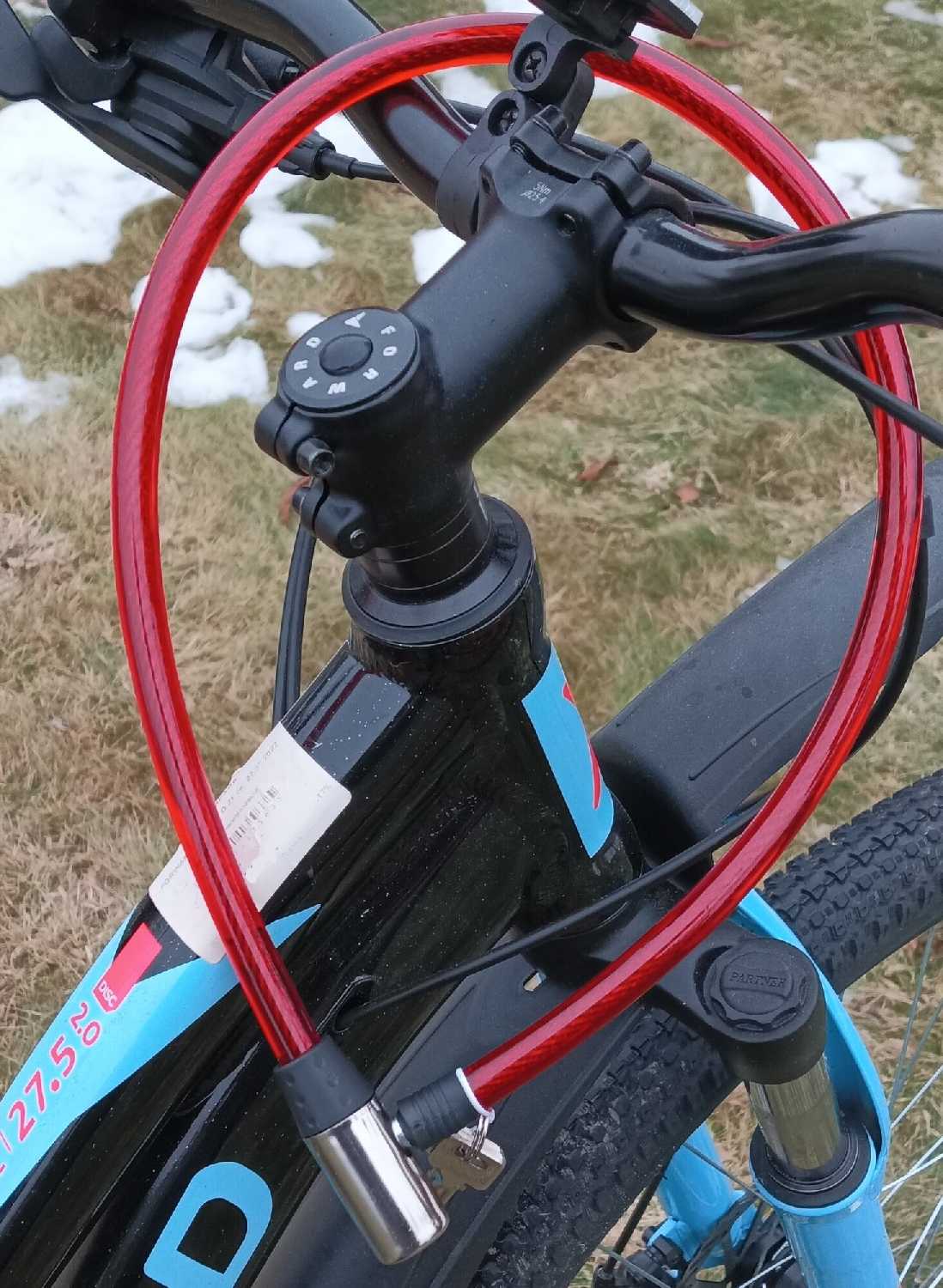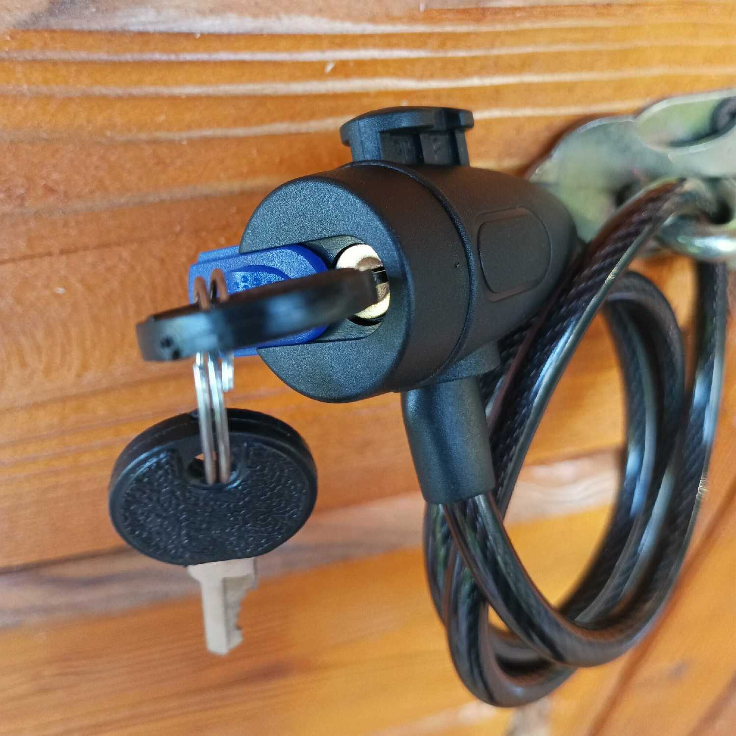 - Яркая расцветка троса и замка выполняет предупреждающую функцию, сигнализируя о наличии защиты и потенциально отпугивая злоумышленников.