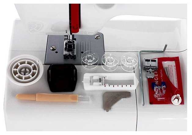 Есть все нужные аксессуары в съемном отсеке: шпульки, лапки, а распарыватель - просто меганезаменимая вещица!))