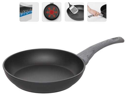 - Хорошая базовая сковородка, не тяжелая. Поверхность шершавая на ощупь. Разогревается равномерно, не пригорает, легко моется. На моей плите сковорода 24 см не работает на большо...