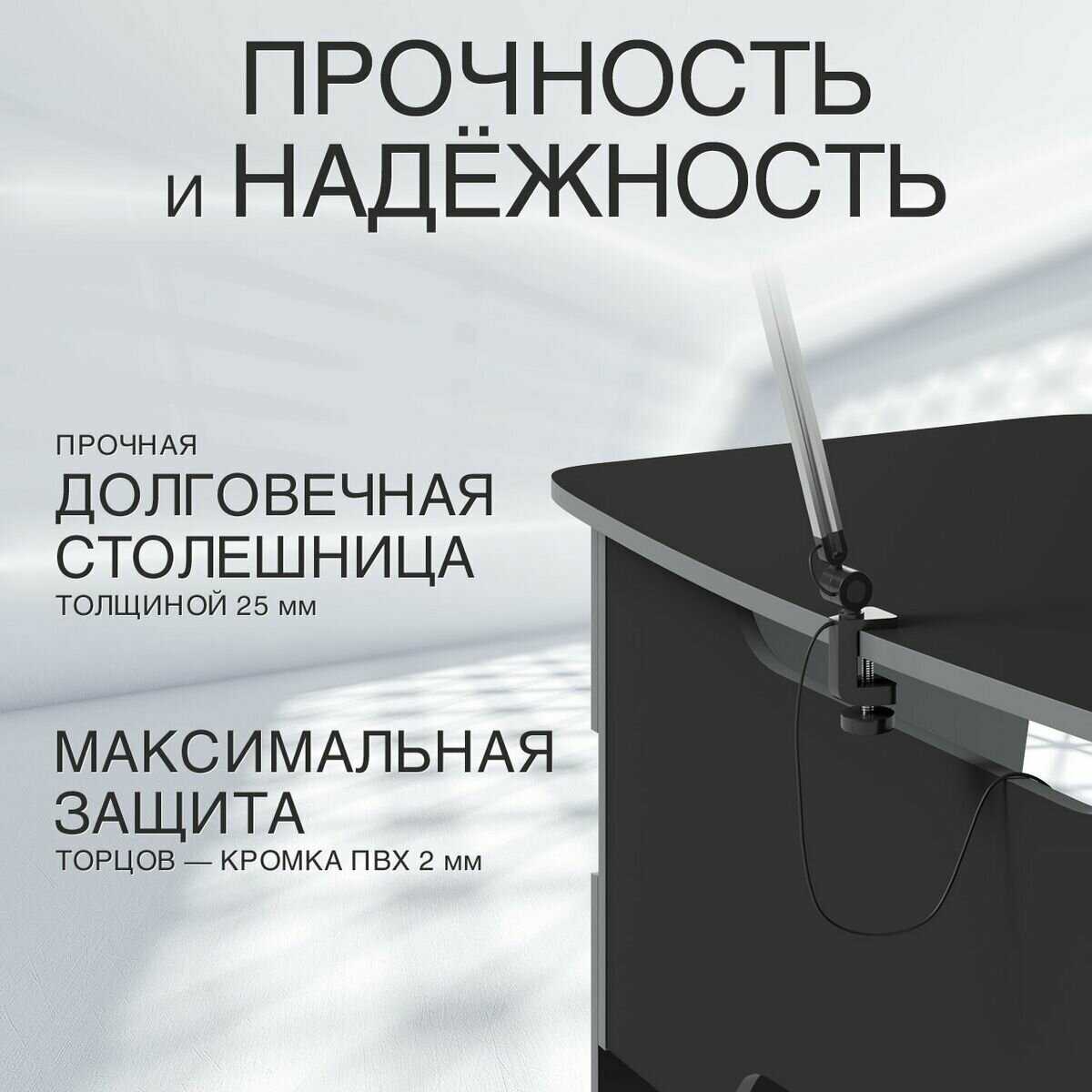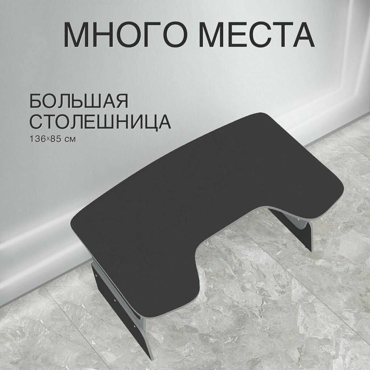 Глубина столешницы (60 см) позволяет комфортно разместить ультраширокий монитор 34 дюйма без потери рабочего пространства для клавиатуры. Однако из-за закруглённой формы переднего края кронштейны на струбцинах крепятся неустойчиво — требуется установка ближе к углам либо использование настенных креплений. -