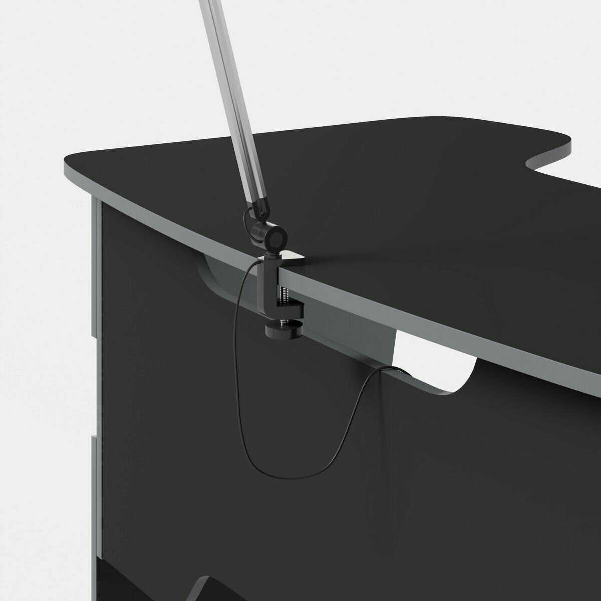 - Длина столешницы 138 см и толщина 22 мм позволяют разместить два монитора (до 32 дюймов), колонки, системник и периферию.