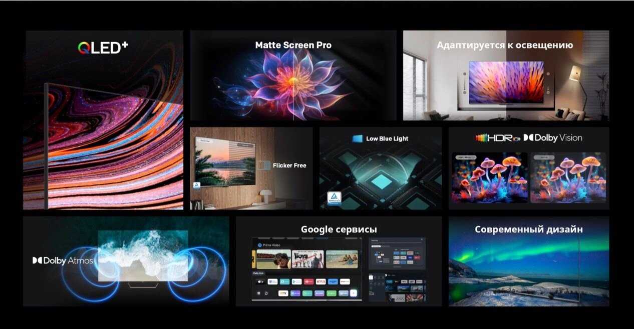 - + Привлекательная цена, беспроцентная рассрочка со сплитом на 6 месяцев, присутствует поддержка технологий изображения/звука Dolby Vision/Atmos, стандарт крепления Vesa 200 на 200, матовое покрытие, яркий, сочный, контрастный Qled+ экран, адаптивная подсветка, защита зрения, память 2/16, платформа Google TV, разрешение 4k Uhd с заявленной поддержкой частоты 60 fps!)
