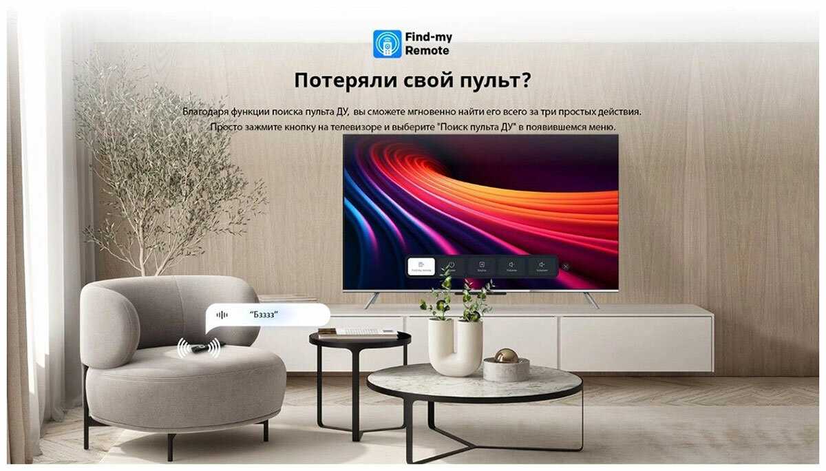- + Отличный телевизор. мы очень довольны. Есть поиск пульта- думала никогда уже не придумают эту фичу.=) Матовый экран, смарт ТВ и пульт очень удобные.