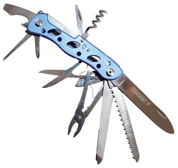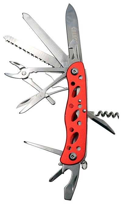 Инструменты (функции) : | ножницы пила нож открывашка штопор напильник шило щипцы консервный нож крестовая отвёртка 4мм крестовая отвёртка 3мм |