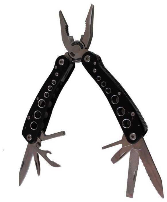 Инструменты (функции) : | подпружиненные пассатижи с кусачками нож с прямой заточкой нож с серрейторной заточкой пара шлицевых отверток напильник открывалка для консервов и бутылок переходник для адаптера бит |