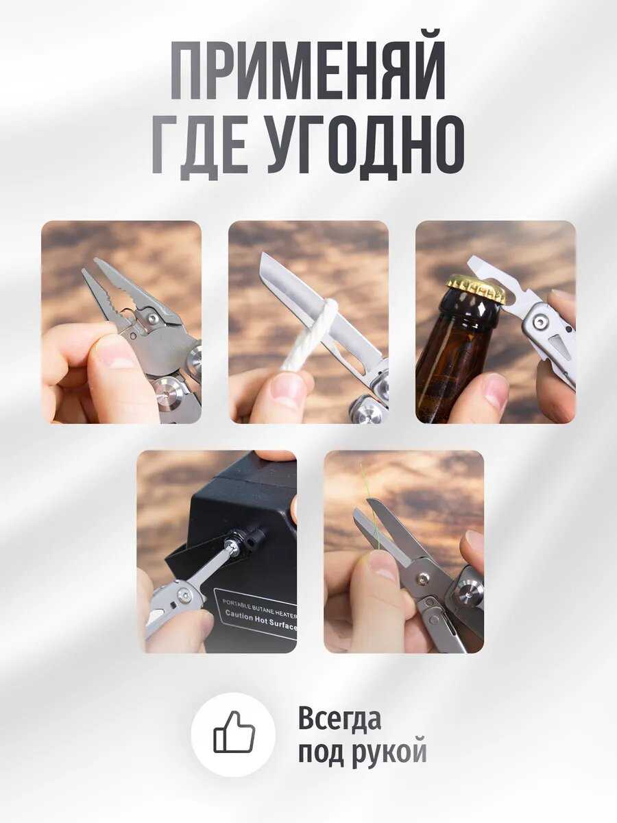 | Инструменты (функции) : | гаечный ключ, карабин, консервный нож, кусачки, напильник, нож, ножницы, отвертка, открывалка для бутылок, пассатижи, пила, пилка для ногтей, плоскогубцы, сменные биты, стеклобой, фонарь, шило / кернер, штопор, щипцы |