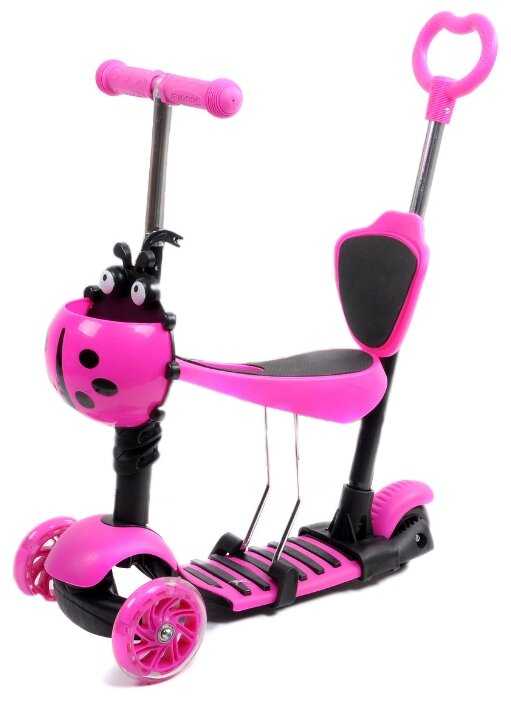 Хороший самокат, довольно крепкий и красивый. Снимаю звезду за корзинку, так как она как ее не закручивай болтается, пришлось подматывать изолентой, и за отсутствие подножки когда заказывала не досмотрела, а докупить отдельно не где даже в интернете.