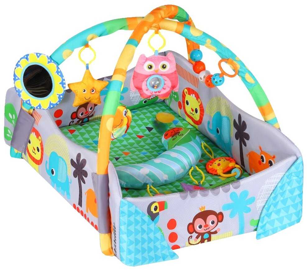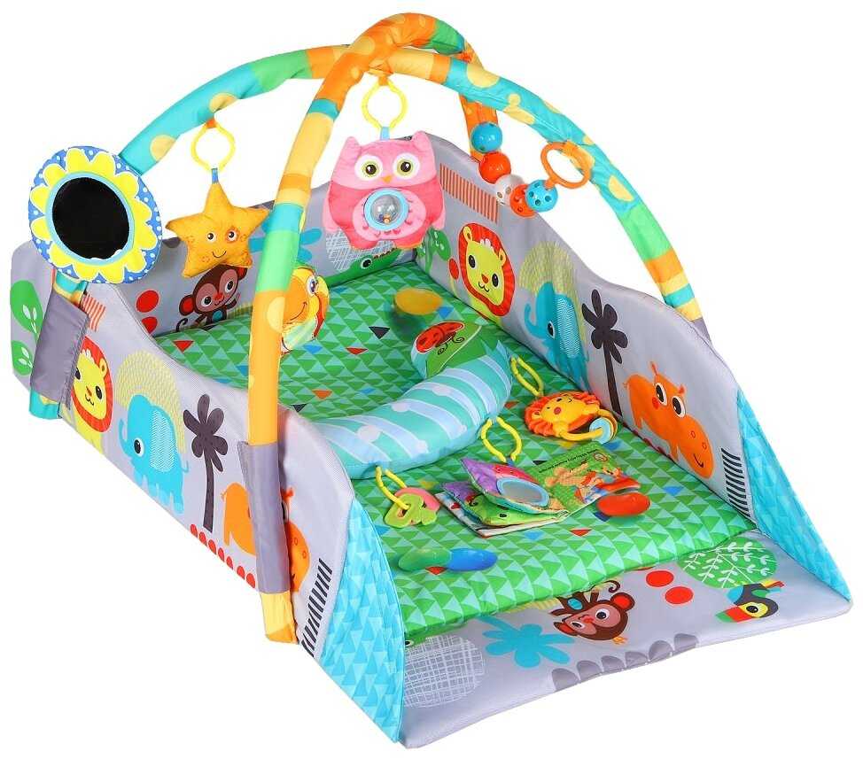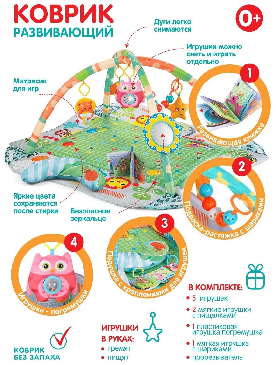 - + Яркий, много игрушек и все разные - мягкая сова, погремушка лев, шарики, зеркальце , еще мягкие игрушки