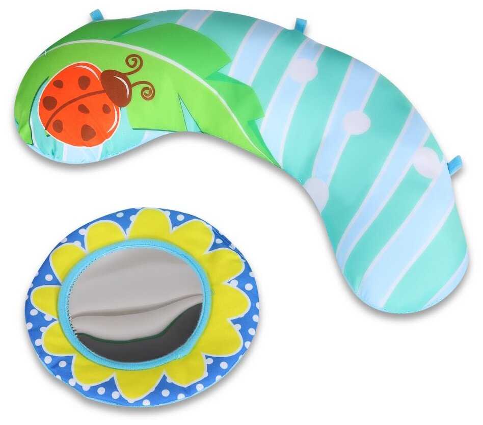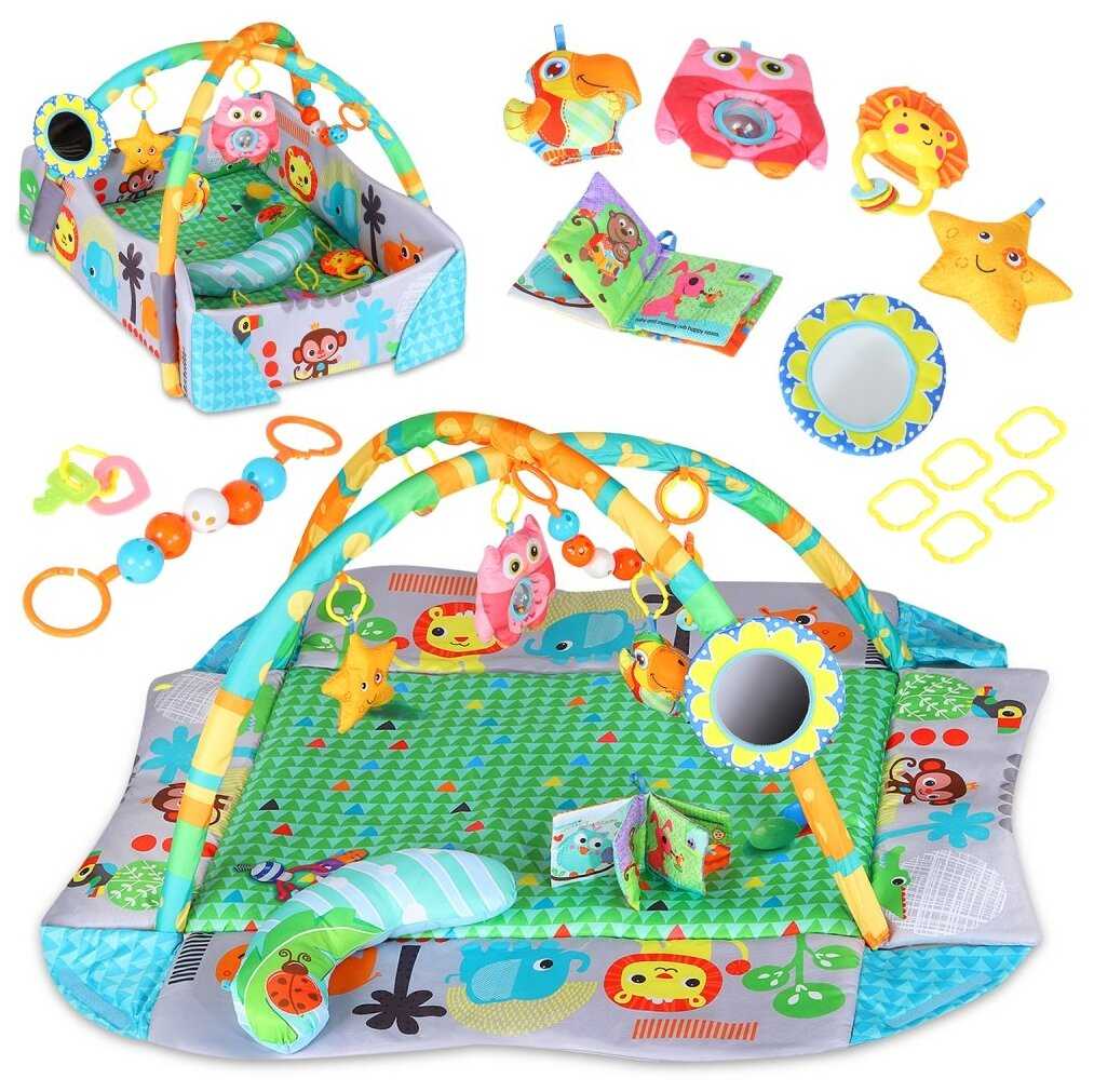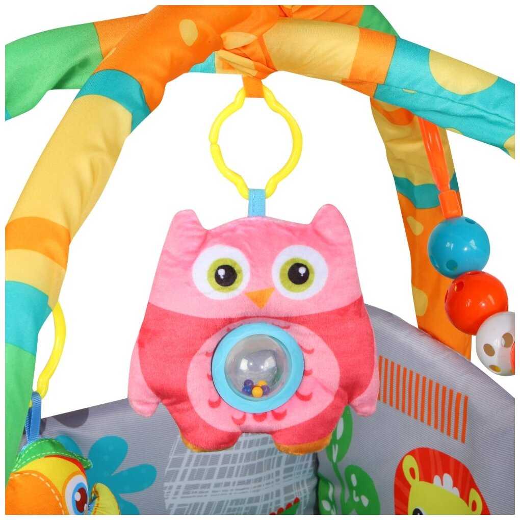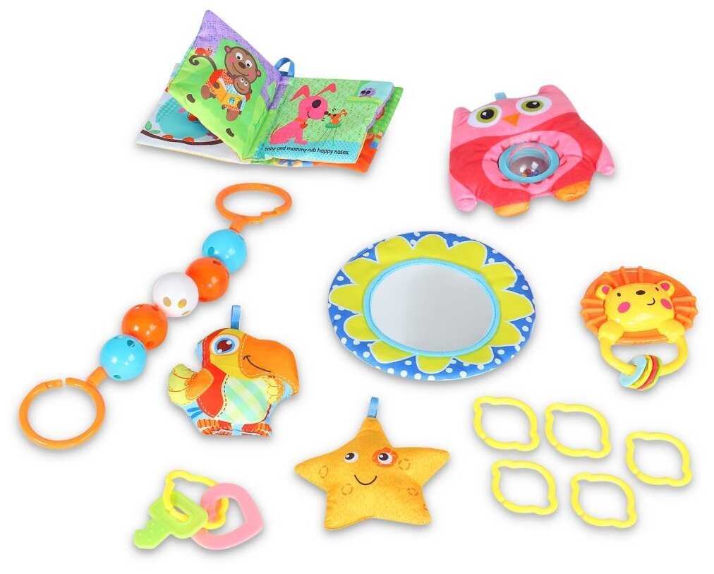 - + Яркий, много игрушек и все разные - мягкая сова, погремушка лев, шарики, зеркальце , еще мягкие игрушки