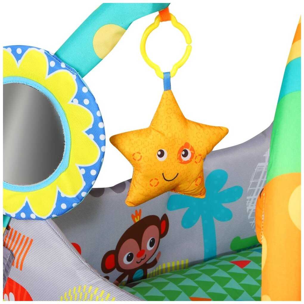 в меру яркий, выбирала с возможностью регулировать размер, сейчас малышу 2 месяца и очень удобно что есть бортики - ребенок не скатится за пределы коврика благодаря им